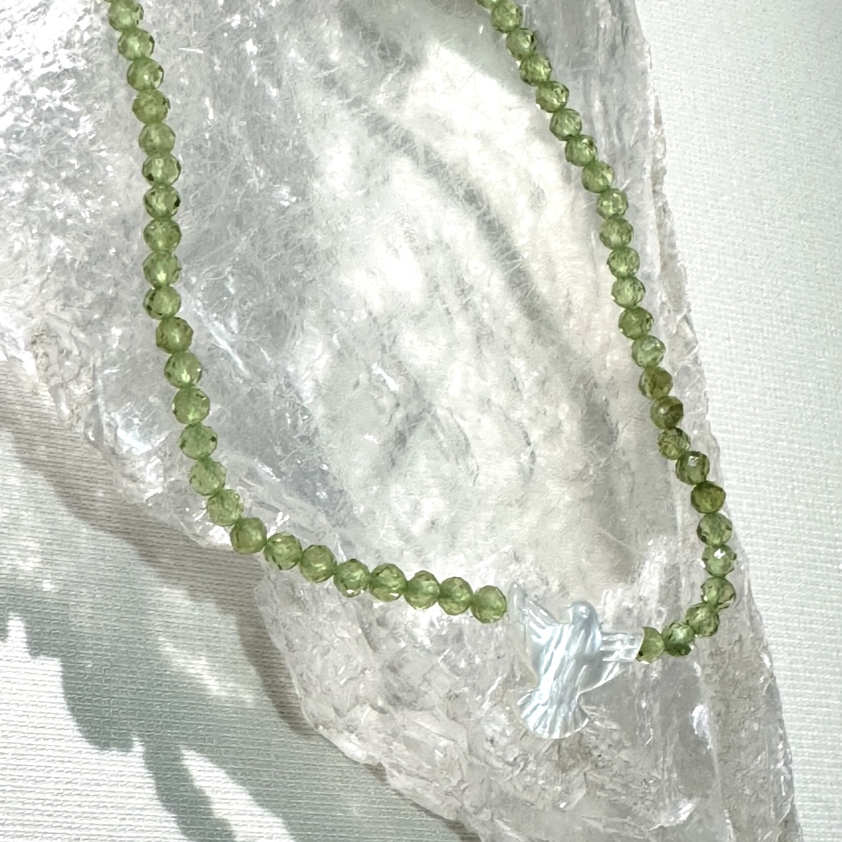 Colar Crisólita – Peridoto facetada 2,5mm – Espírito Santo madrepérola
